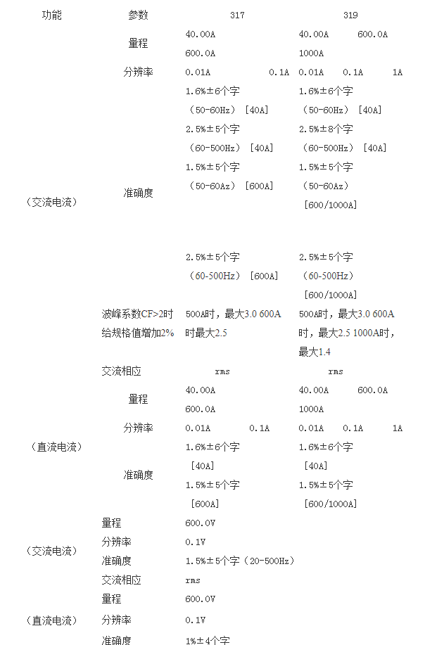 FLUKE319是一種用電池操作的手持式鉗表,可測量: